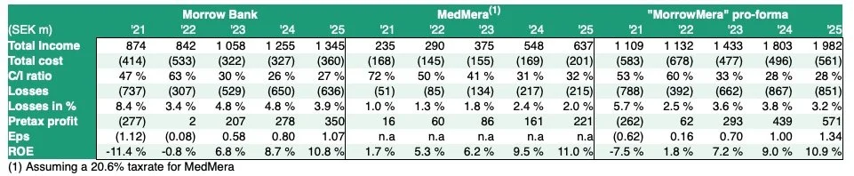 MedMera is a Consumer Finance Bank in Sweden sized 66% of Morrow. It's owned by and closely linked to KF and COOP Sweden. Price is SEK 1.96 bn corresponding to 1.06x book value at closing date (early Q3) which is slightly lower than Morrows P/B today. Synergies are significant and will mainly be on buyers' side but will partly also benefit seller since approx. 10% of Morrow will be owned by the seller after closing. That future ownership to KF/Coop is also a positive since a distribution agreement follows the deal.