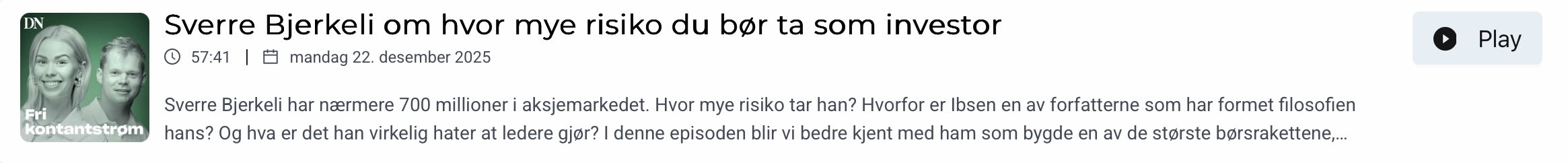 Dagens Næringslivs nye Podcast "Fri kontantstrøm" har nettopp sluppet en episode med en liten time med Sverre. Temaer hopper innom blant annet "hvem er du", "Hvaler Invest sin investeringsfilosofi", "risiko", "hva kjennetegner gode investorer" og "hva kjennetegner dårlige ledere".
